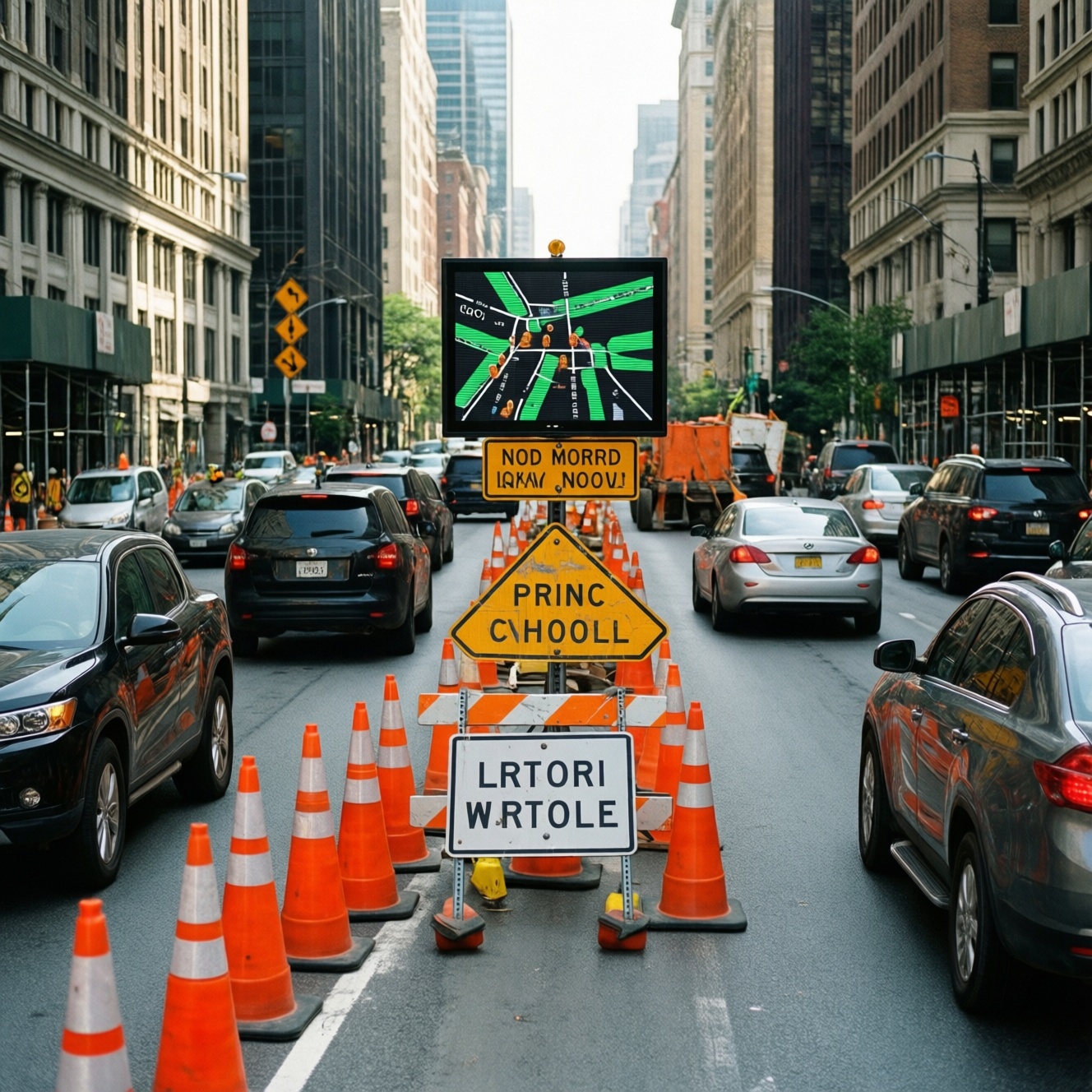 - Сужение перед перекрёстком: держитесь "рабочей" полосы заранее (за квартал), чтобы не перестраиваться у конусов; ожидайте запрета остановки на подходах.